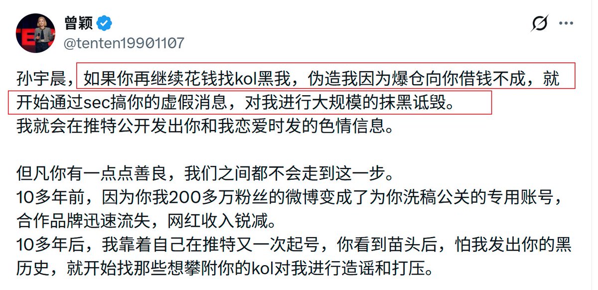 曾老师这么多年过去了,偷换概念的撒谎技术依然精湛,你看,她不直接说聊天记录是假的,但就是能用语言的艺术让你乍一看就会下意识的自己得伪造聊天记录的结论,最后如果真的掰扯细节,她会让你看原话,好像也没乱说,因为她这个句子的核心,只是在说孙宇晨抹黑和诋毁“因为XX,所以XX”这个因果关系而已