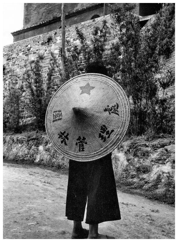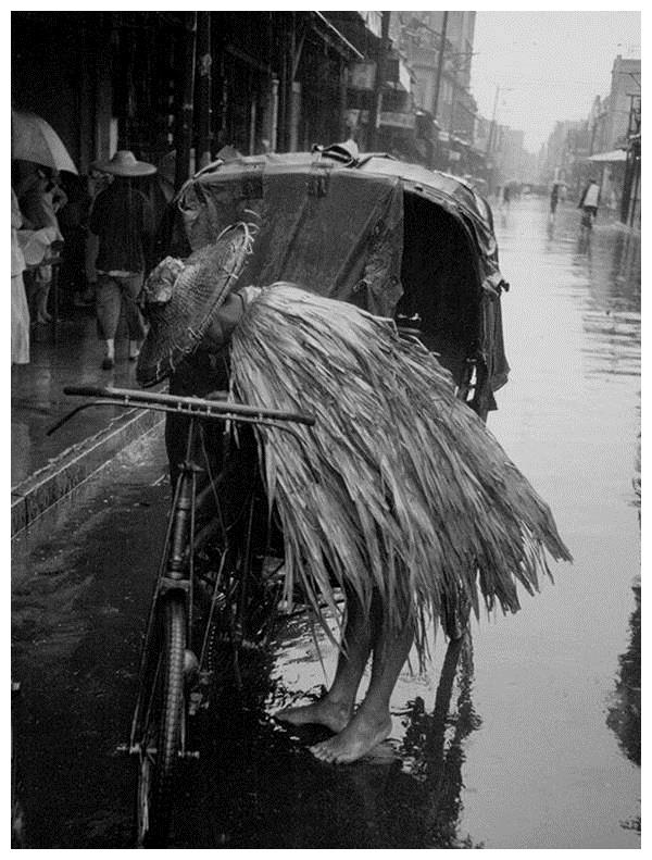 3.广州街头,一名戴斗笠穿蓑衣的车夫。