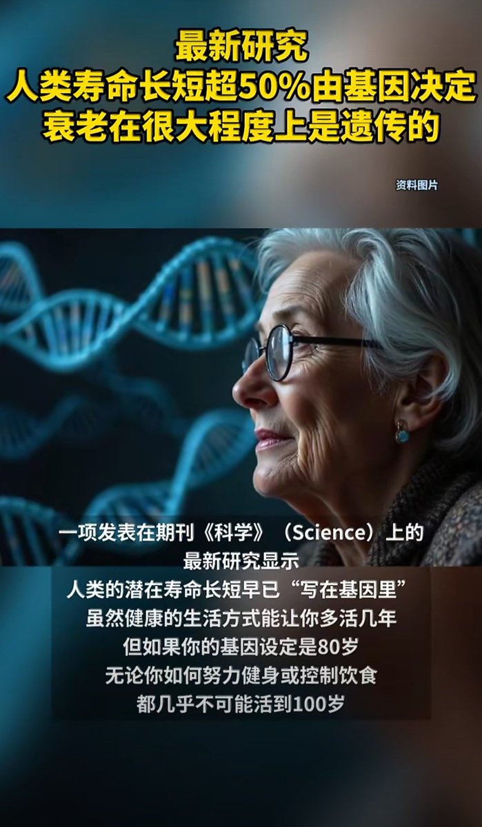一项发表在期刊《科学》(Science)上的最新研究显示,人类的潜在寿命长短早已“写在基因里”。虽然健康的生活方式能让你多活几年,但如果你的基因设定是80岁,无论你如何努力健身或控制饮食,都几乎不可能活到100岁。
