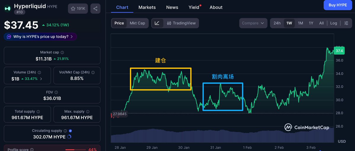 01.28-01.29 疯狂采购超 3162 万美元 $HYPE 的巨鲸,已在 2 天前币价低点时割肉离场,他的买入均价在 ~$33 附近,卖出价格则为 ~$30,甚至是亏本走的