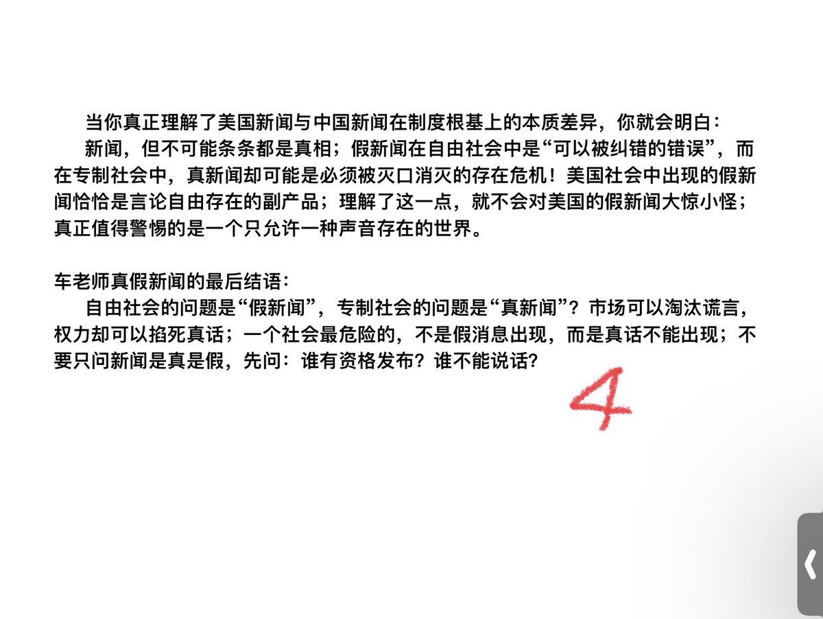 自由社会的问题是“假新闻”,专制社会的问题是“真新闻”?市场可以淘汰谎言,权力却可以掐死真话;一个社会最危险的,不是假消息出现,而是真话不能出现;不要只问新闻是真是假,先问:谁有资格发布?谁不能说话?