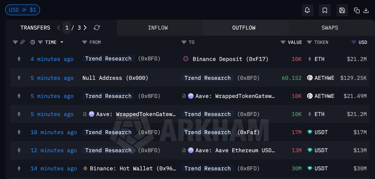 5 分钟前 Trend Research 将 10000 $ETH 充值进 #Binance 并疑似卖出,价值 2120 万美元;而 15 分钟前他们刚从币安提出 3000 万枚 USDT 用于偿还借款
