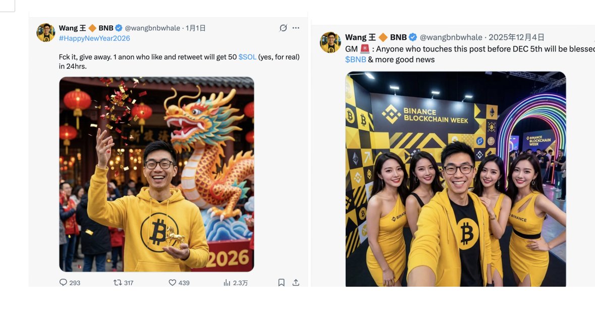 我看了一下,这一批账号都有明显共性:统一改 ID、统一加 BNB 后缀,而且清一色是 AI 生成的和 CZ 的合照或“现场图”。昨天看 wolfyxbt(杀破狼) 说,现在 AI agent 已经可以做到:批量注册邮箱 → 邮箱注册 X → X 自动发帖。说白了,如果现在要用 X