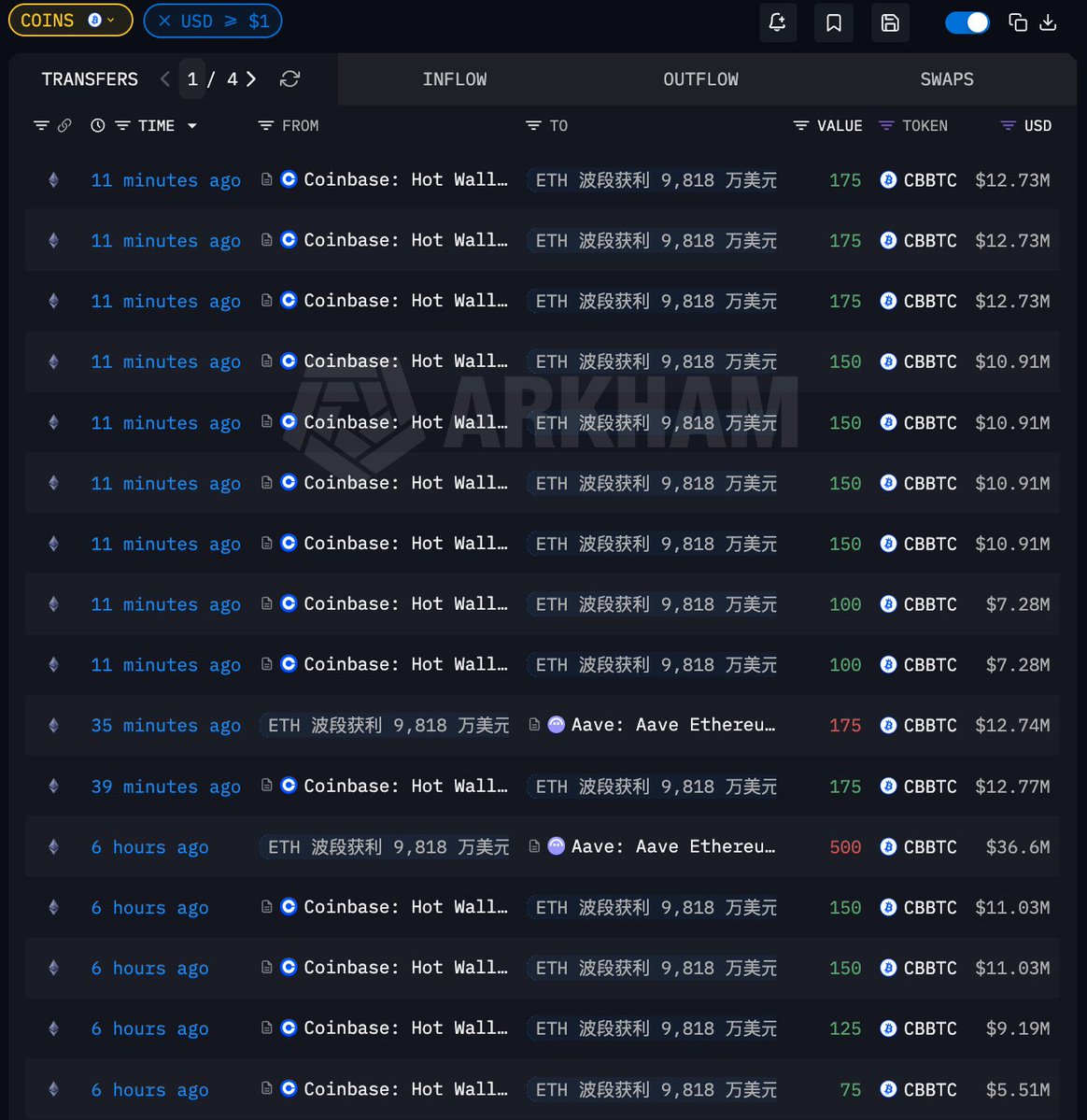 「ETH 波段获利 9922 万美元的聪明钱」过去 8 小时又囤积了 2500 枚 cbBTC,价值 1.82 亿美元,一次比一次买得多…