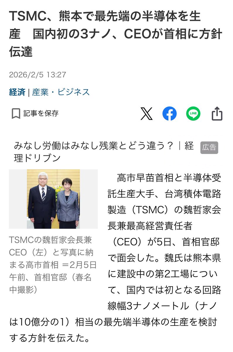 擁有最先進半導體製程的台灣台積電向高市早苗總理傳達了將在日本生產3奈米晶片的意願!
