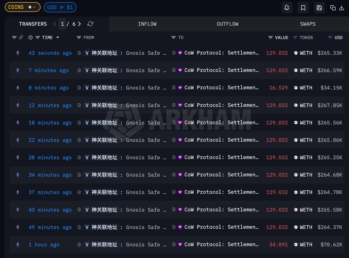 02.02 以来多签地址已累计通过 Cowswap 出售 4521.59 枚 ETH,总价值 993.9 万美元,平均卖出价格 $2202.44,目前仍在持续卖出中