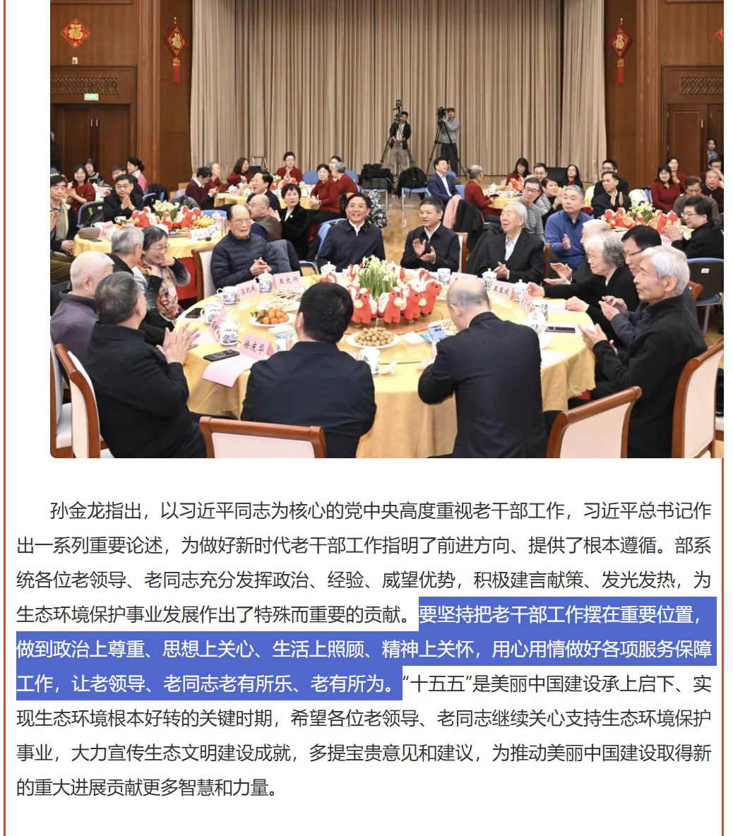 中国生态环境部党组书记孙金龙2月4日出席老同志工作情况通报会暨新春茶话会,称要坚持把老干部工作摆在重要位置,用心用情做好各项服务保障工作,让老领导、老同志老有所乐、老有所为。