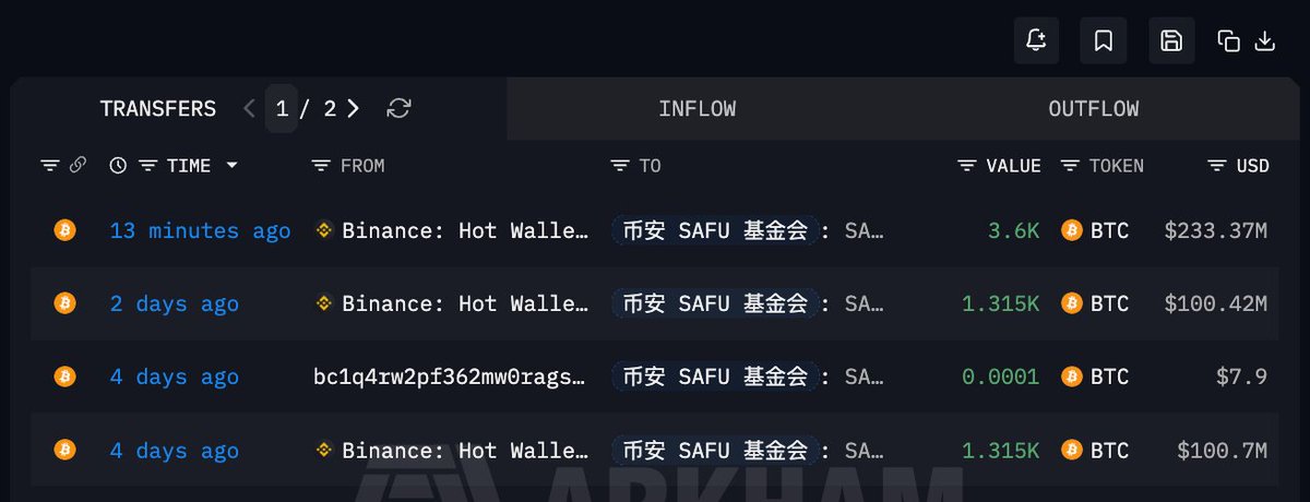 Binance SAFU 基金地址时隔两天再次买入 3600 $BTC !