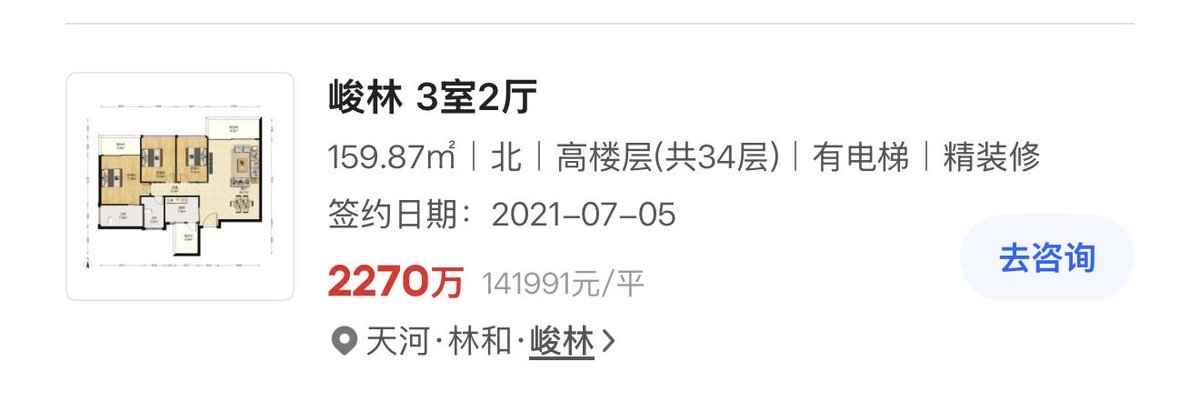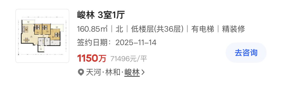 大县城天河北的最高端楼盘,香港新鸿基开发的峻林,也就是飞人苏老师买的那个楼盘,最新的价格也降到了7万一平(比图片里的成交日期要新,价格更低),而且是260平的豪宅面积的单价,已经腰斩。这个小区在中信附近,配套学位也是天河区最好的之一。