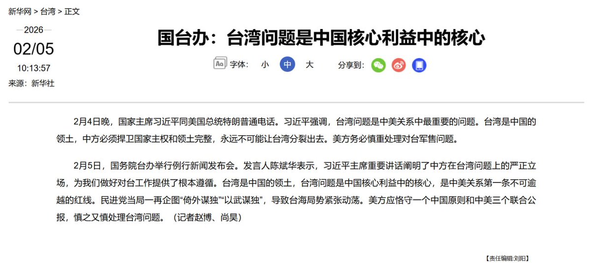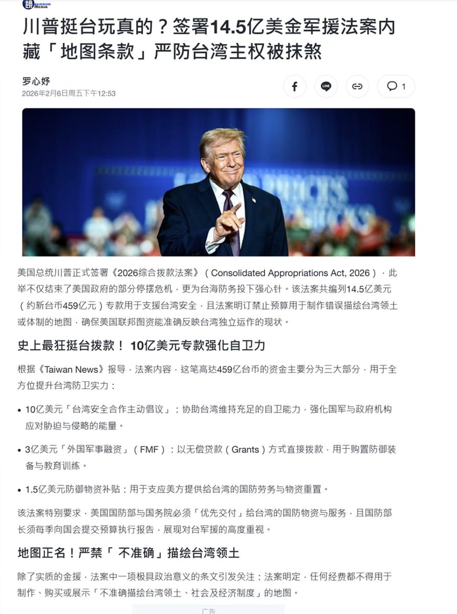 川习通话后,中美在台湾问题上再度对撞 2月5日。习近平大谈台湾。 他表示:台湾问题是中美关系中最重要的问题。台湾是中国的领土,永远不可能让台湾分裂出去。美方务必慎重处理对台军售问题。 而特朗普则正式签署《2026综合拨款法案》。 该法案共编列14.5亿美元专款用于支援台湾安全,且法案明订禁止预算用于制作错误描绘台湾领土或体制的地图,确保美国联邦图像资料能准确反映台湾独立运作的现状。
