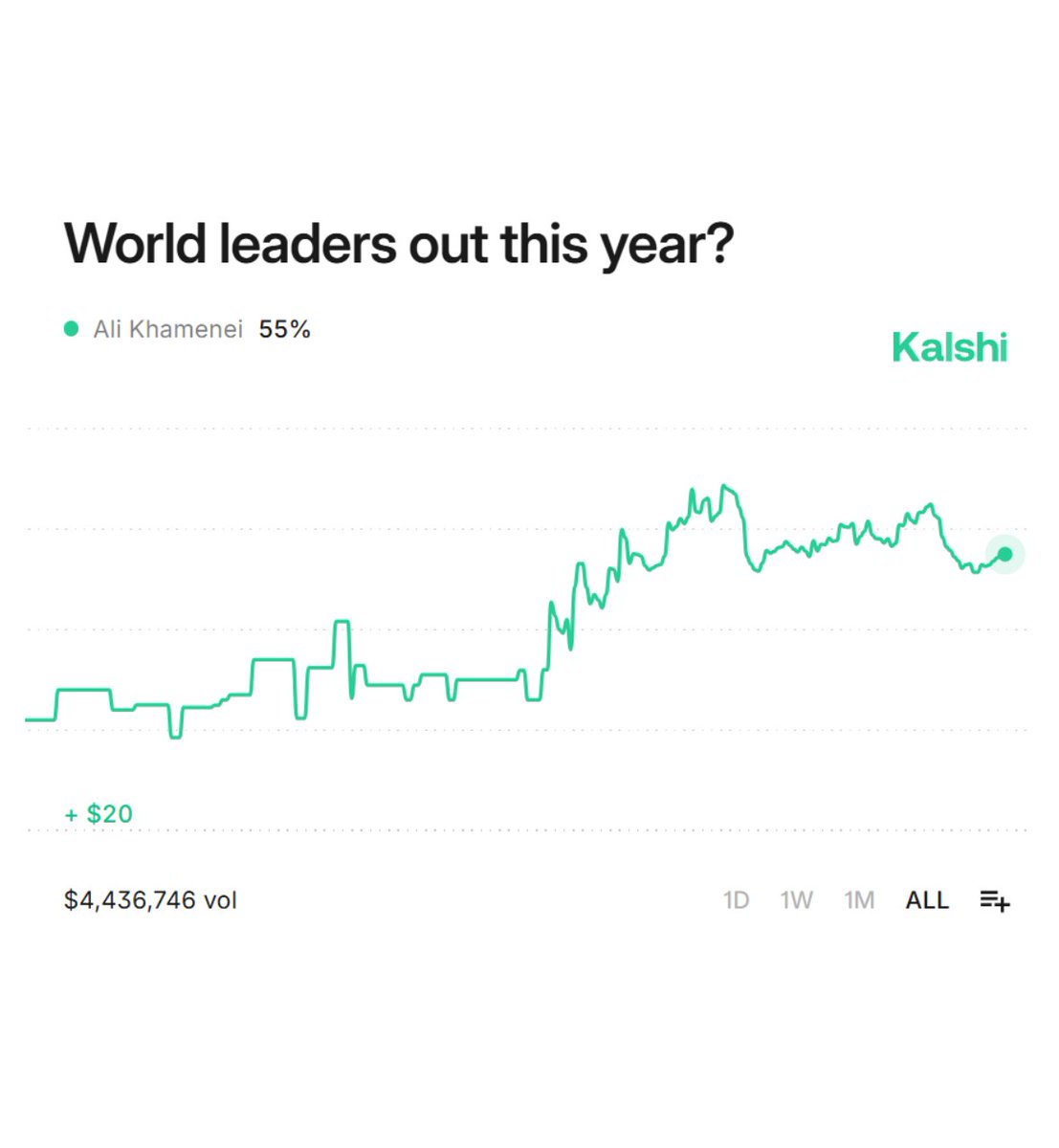 Chances of 🇮🇷 Iran's Supreme Leader being out of power this year are 55% according to prediction market.