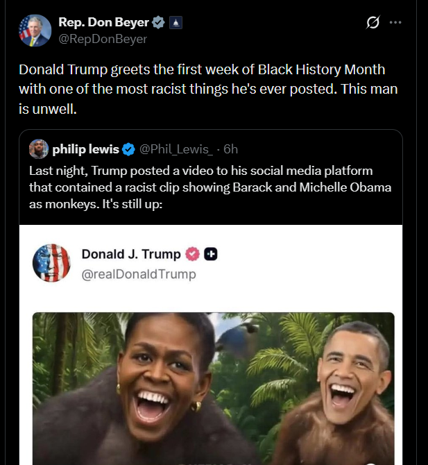 众议员堂·拜尔:唐纳德·特朗普在黑人历史月的第一周发布了他有史以来最具种族歧视色彩的言论之一。这个人精神有问题。