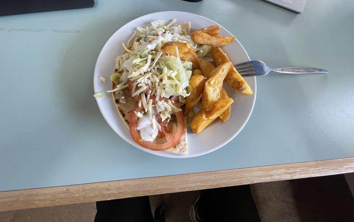 养老院今天吃yiros,中文叫土耳其烤肉?厨师给我也打了一份,羊肉被配菜覆盖了,味道不错。在养老院上班就是这个好,每天被投喂。