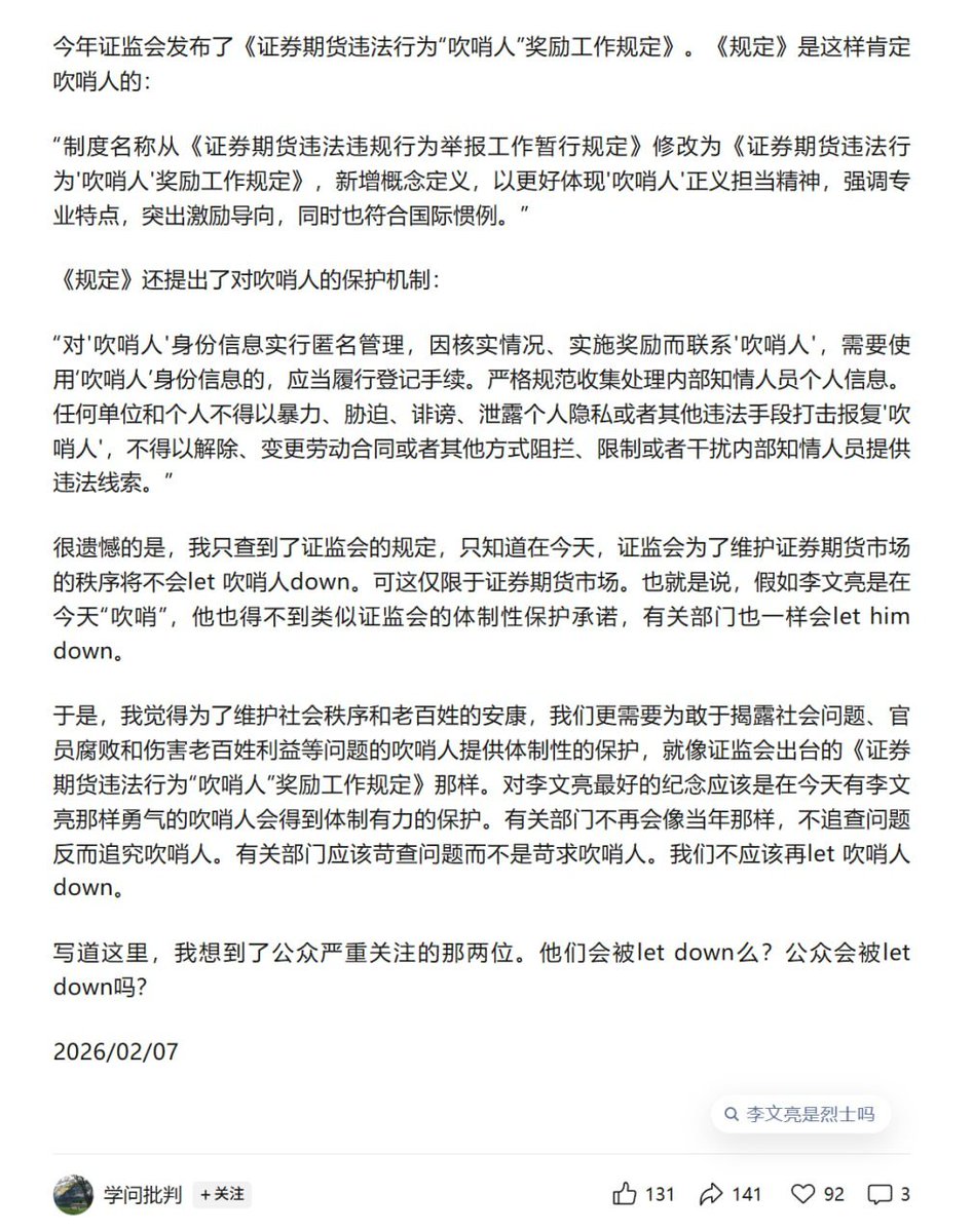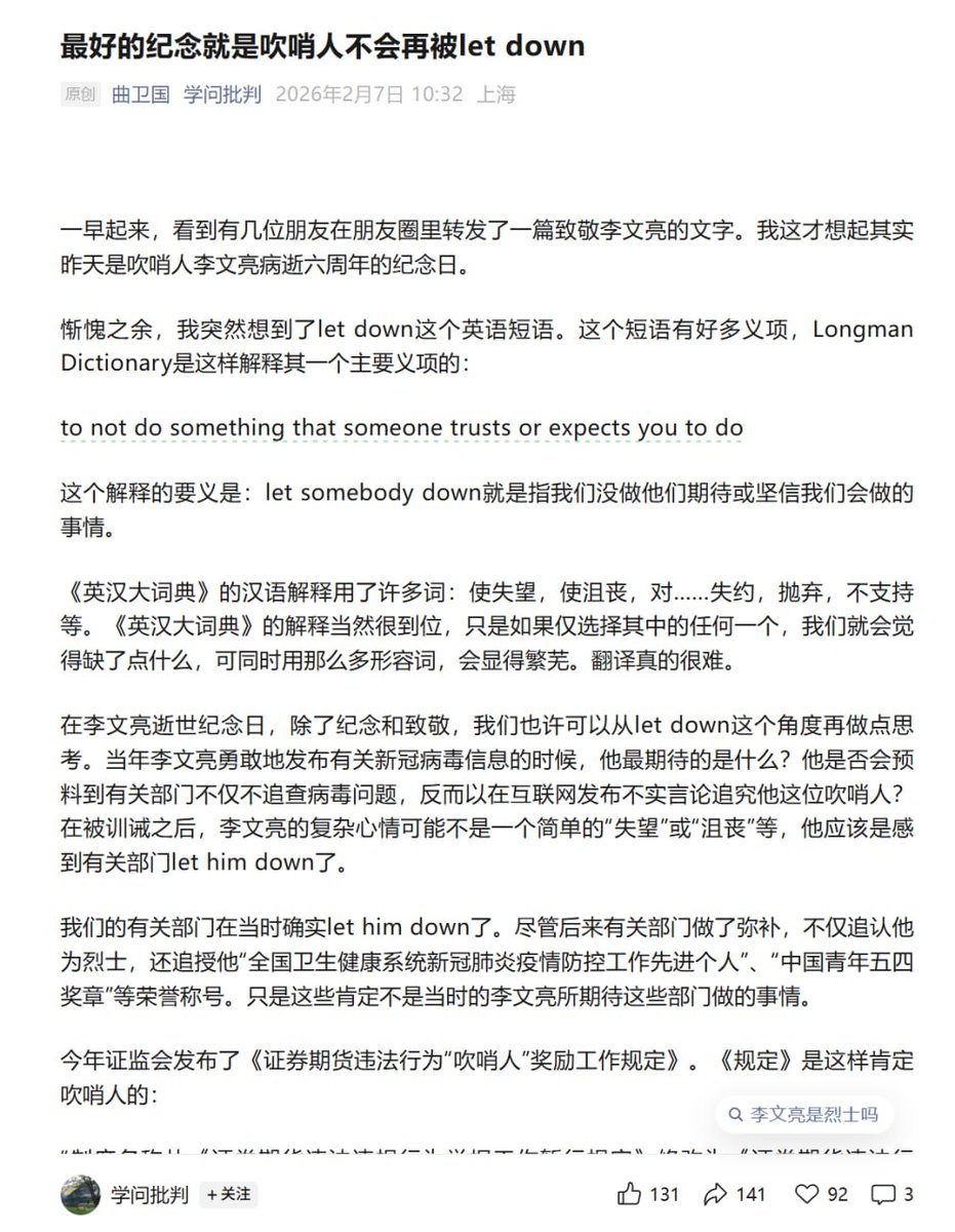 2月7日,复旦大学教授曲卫国发文:最好的纪念就是吹哨人不会再被let down