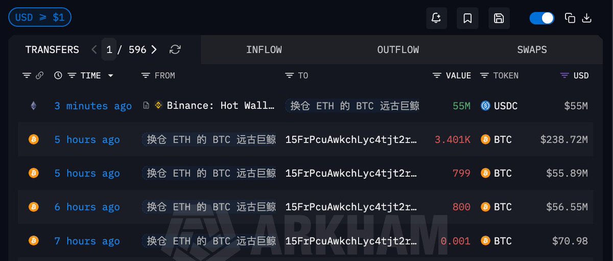 「爆仓 2.3 亿美元的 1011 巨鲸」过去 6 小时向 #Binance 充值了 5000 枚 BTC(价值 3.5 亿美元),5 分钟前从币安提出 5500 万枚 USDC,所以这是部分 BTC 已经卖掉了?