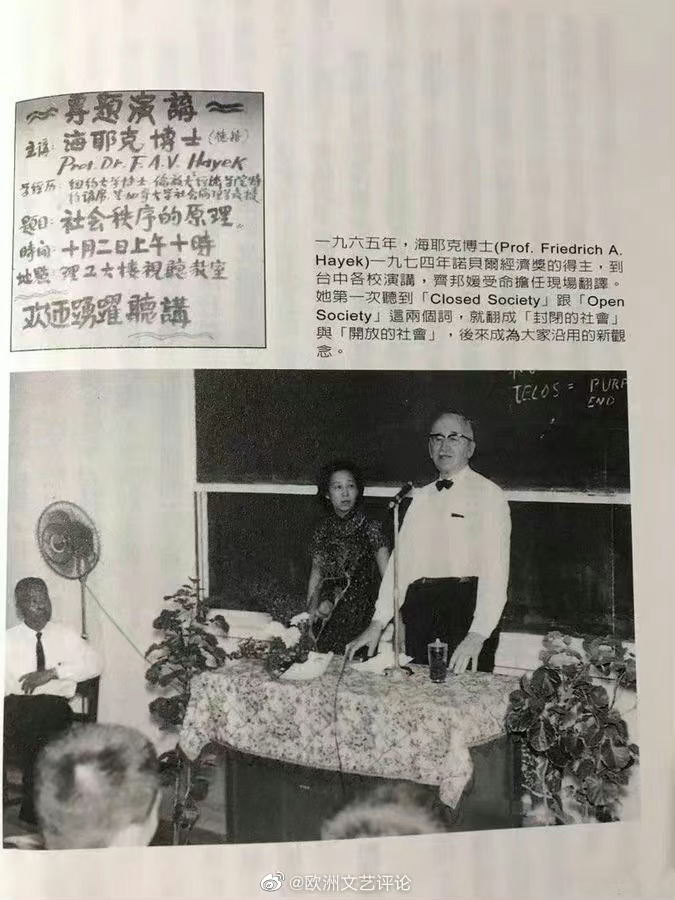 1965年,哈耶克到台湾做讲座,齐邦媛担任翻译。齐女士将Closed society 与Open society 翻译为“封闭的社会”和“开放的社会”,后来为中文届沿用至今。