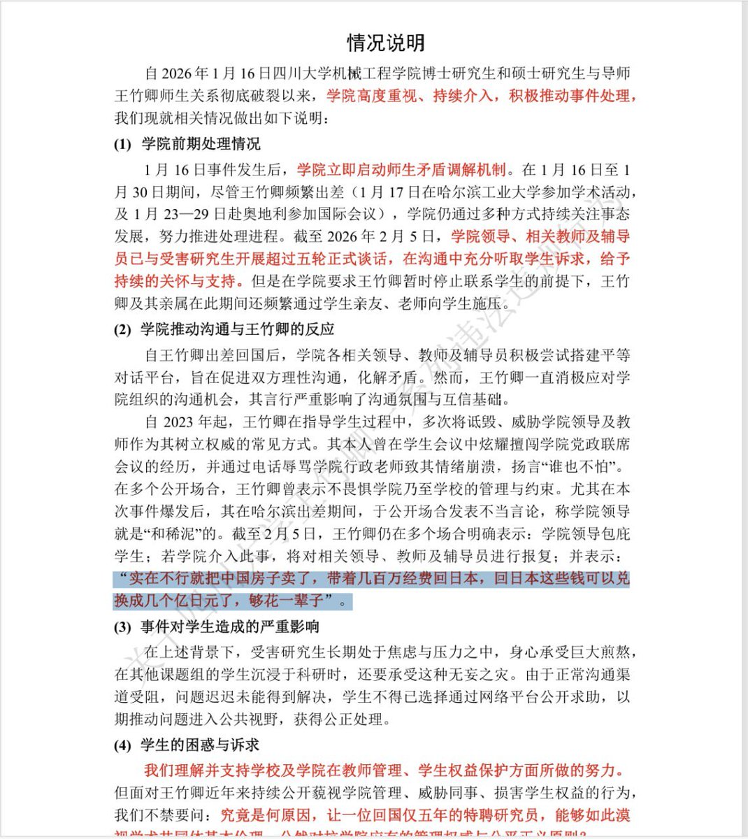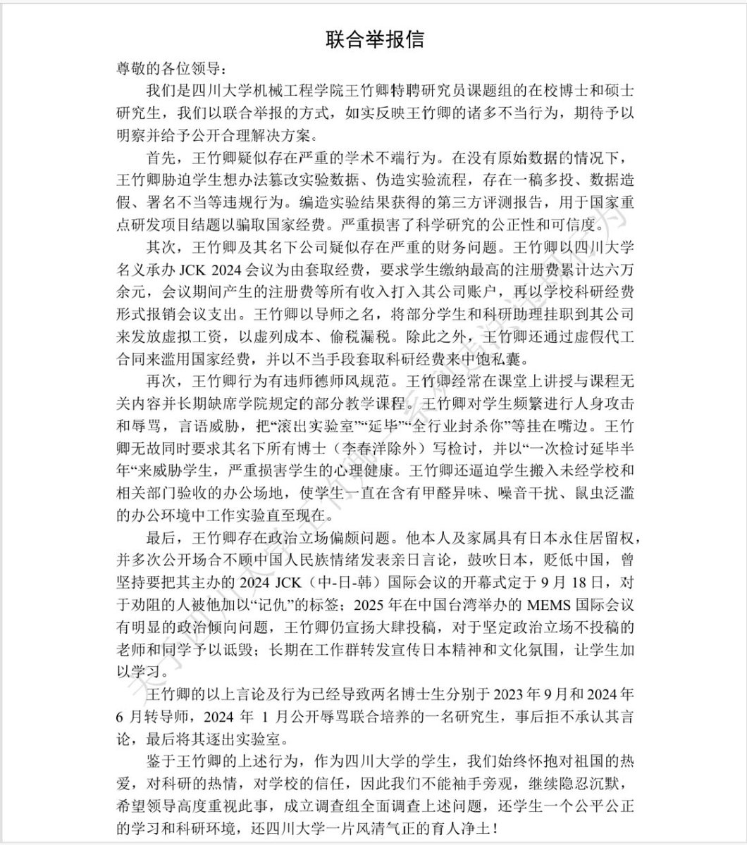 “多名硕博生实名举报四川大学博导王竹卿”近日,四川大学机械工程学院博导王竹卿,被多名硕博生实名举报。举报内容涉及学术不端、经费侵占、师德失范、政治立场争议等多重问题。举报材料高达83页。