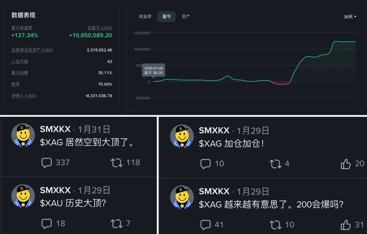 币安账户 SMXKX 广场显示他从一月下旬起做空白银(XAG),浮亏一度超百万美金,又在黄金 01.29 短期高点做空,最终在 02.05 达到盈利最高点 1238 万美元