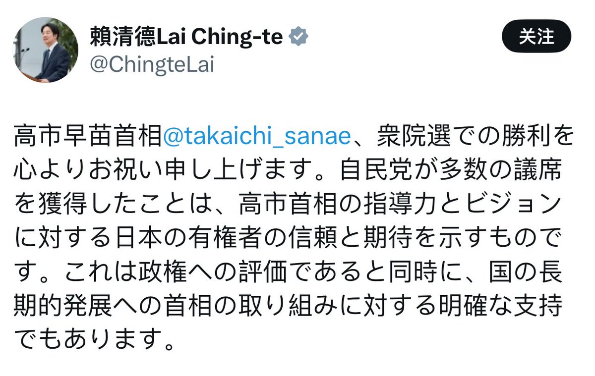 台湾国总统赖清德第一时间祝贺高市早苗