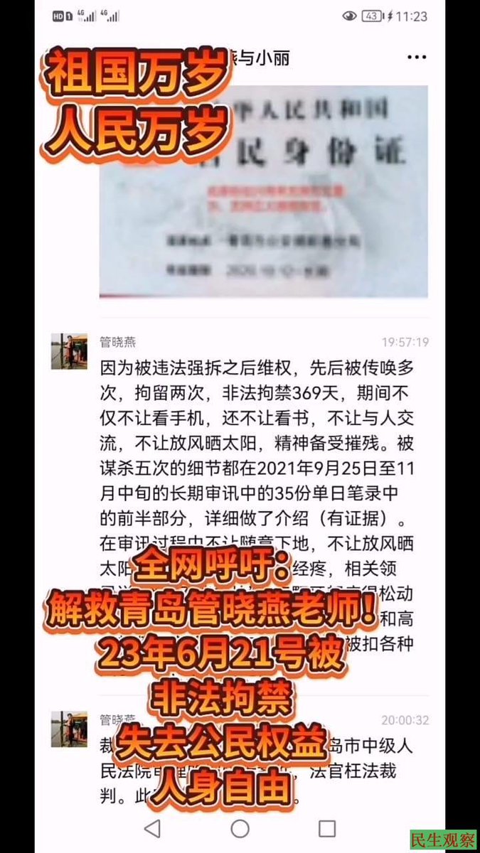 #中国人权 #每日一推 #良心犯 之244期:黑暗中有一束燃烧的蜡炬。一小学高级女教师房屋遭强拆,其不忍屈辱毅然发起“金色的翅膀”访民群体签名,2023年5月联署总人数达11800多人(签名人均以身份证正反面照片为实名依据)此壮举使当局成惊弓之鸟,其随遭抓捕,2026年2月6日山东人权捍卫者管晓燕被冤判4年