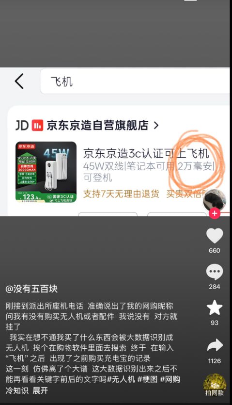 为弄清缘由,博主开始逐一在购物平台检索自己的购买记录。终于在输入“飞机”之后出现了之前购买充电宝的记录,终于找到了罪魁祸首:京东京造3c认证充电宝。