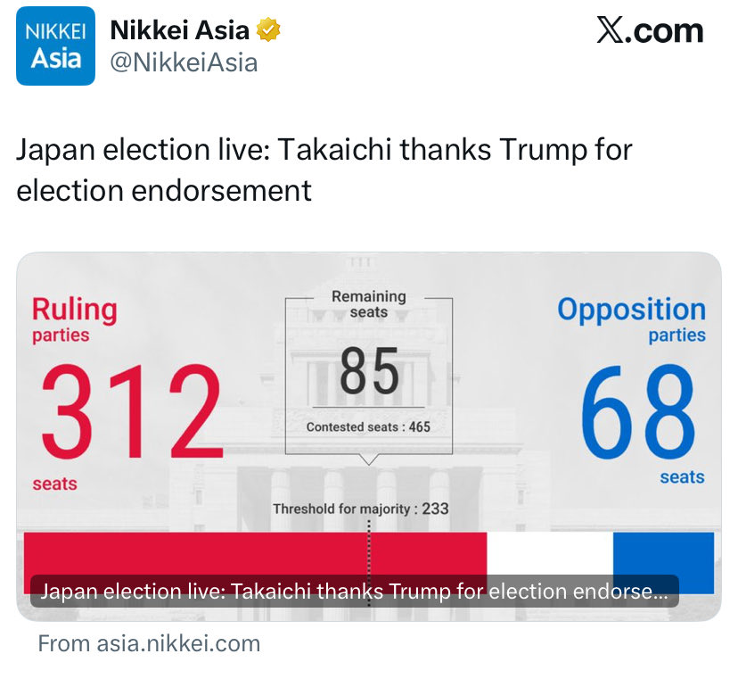高市早苗领导的自民党在日本众议院选举中的大胜,超过了修宪所需的门槛。中共尴尬了:本想用两用物项禁运卡日本的脖子,迫使高市早苗改变对台湾的态度,没想到日本选民一边倒地支持她!