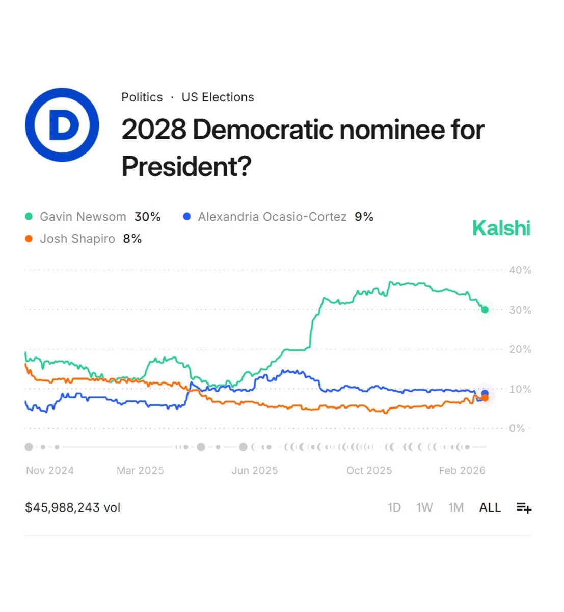 UNITED STATES: Gavin Newsom chances of becoming Democratic presidential nominee continue to decline steadily, now at 30%, followed by Alexandria Ocasio-Cortez at 9%, according to prediction market.