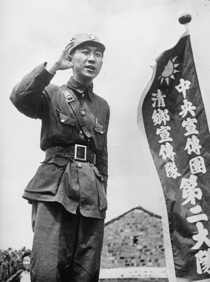 一名汪精衛國民政府中央宣傳團清鄉宣傳隊第二大隊成員對著鄉民群眾演說。這張相片可能出自汪精衛國民政府的中央社,其自1942年加強其相片產能,藉此與蔣介石於重慶帶領的國民政府宣傳活動抗衡。