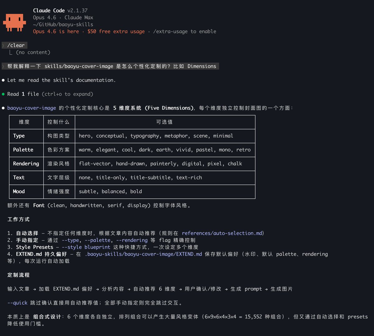 后来我换了个思路:不去穷举风格,而是把"风格"拆解成多个独立维度。以我的 baoyu-cover-image 为例,我把封面图的风格拆成了 6 个维度:
