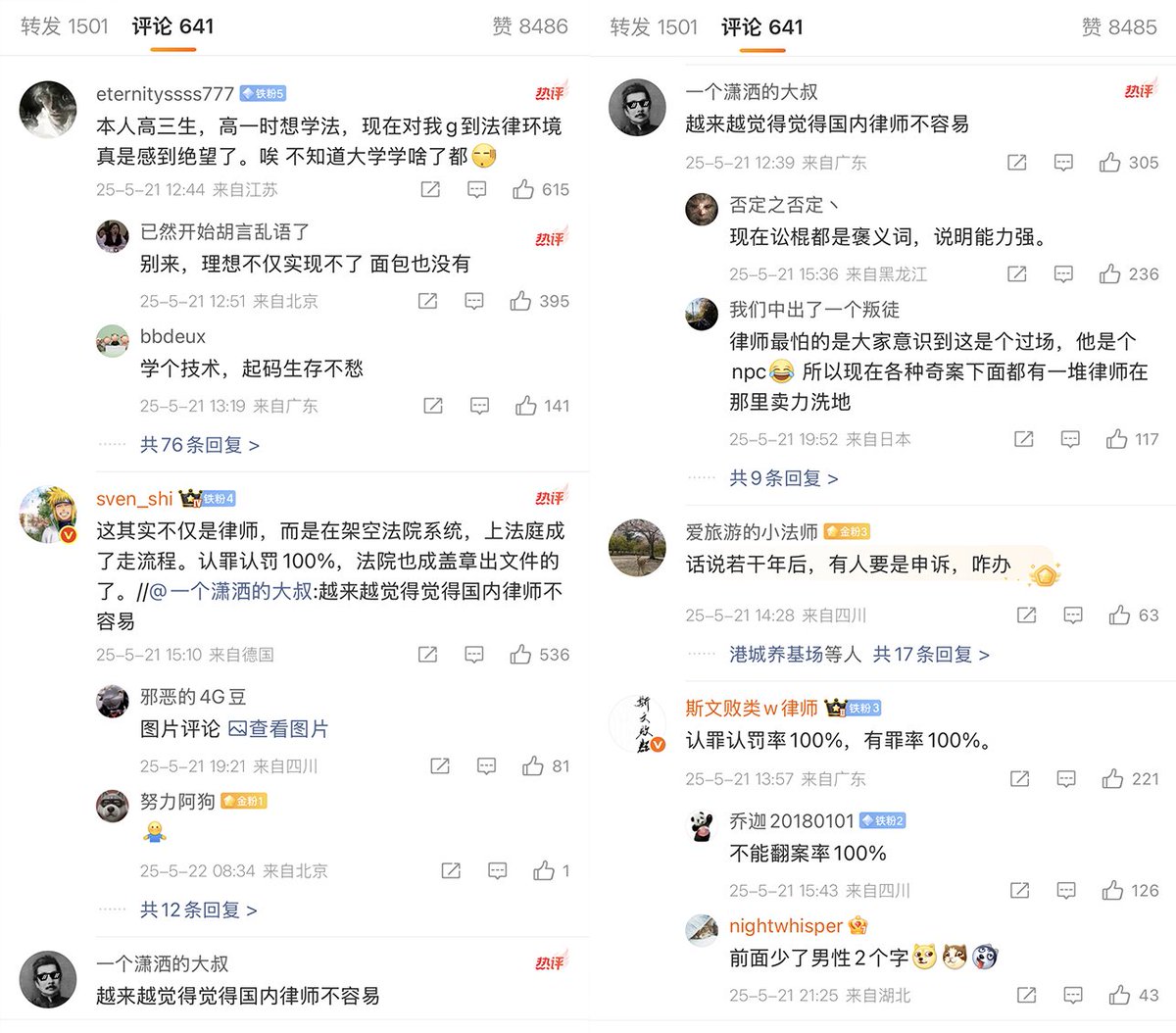 “本院认罪认罚率达到100%”去年5月,庐山市检察院检察长 曾高调宣传,本院认罪认罚率达到100%。彼时,法律圈一片哀嚎,这意味着当地的律师几乎成了摆设,上法庭成了走流程。有网友表示:“我本来计划大学法律的,现在我对我国的法律环境感到绝望”