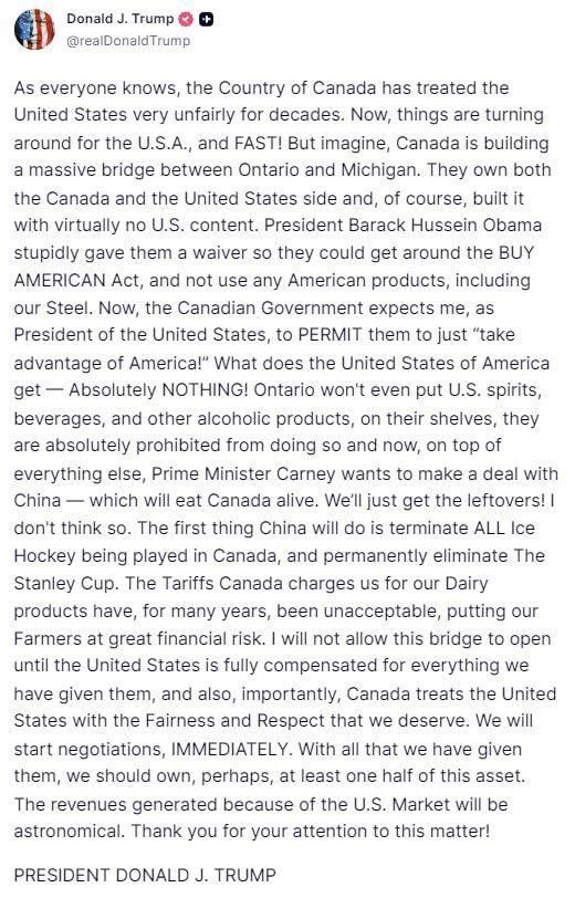 特朗普威脅要阻止美加邊境大橋的開放,理由是"加拿大對美國懷有敵意,且正與中國走得越來越近"。這座橋指的是底特律與溫莎之間的戈爾迪-豪國際大橋,計劃於2026年初開放。它將是美加兩國唯一一座允許行人與自行車通行的大橋。