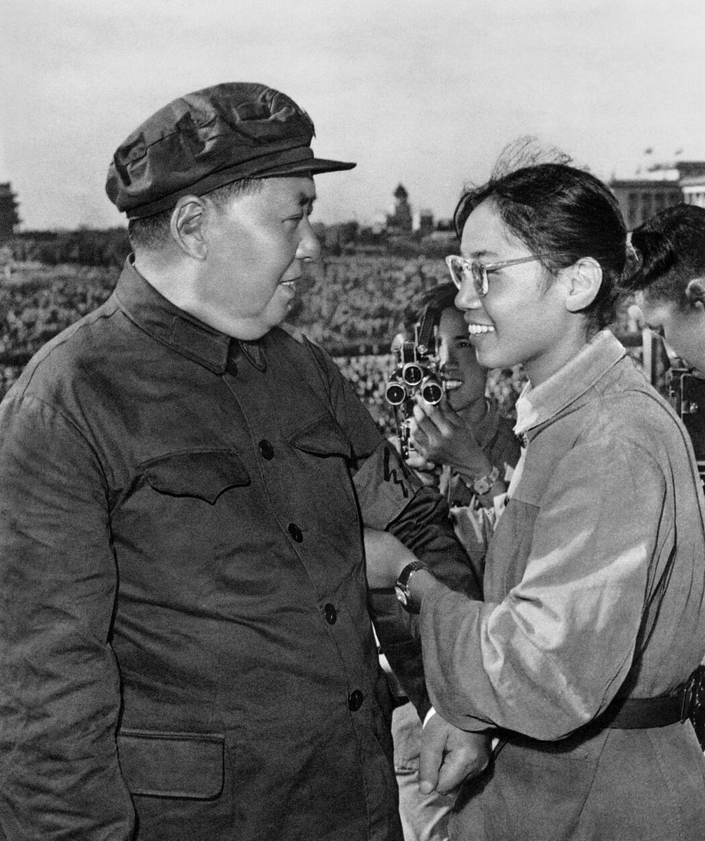 图:1966年,宋彬彬作为一名红卫兵领袖被选中为毛泽东佩戴红袖章。 Apic/Getty Images