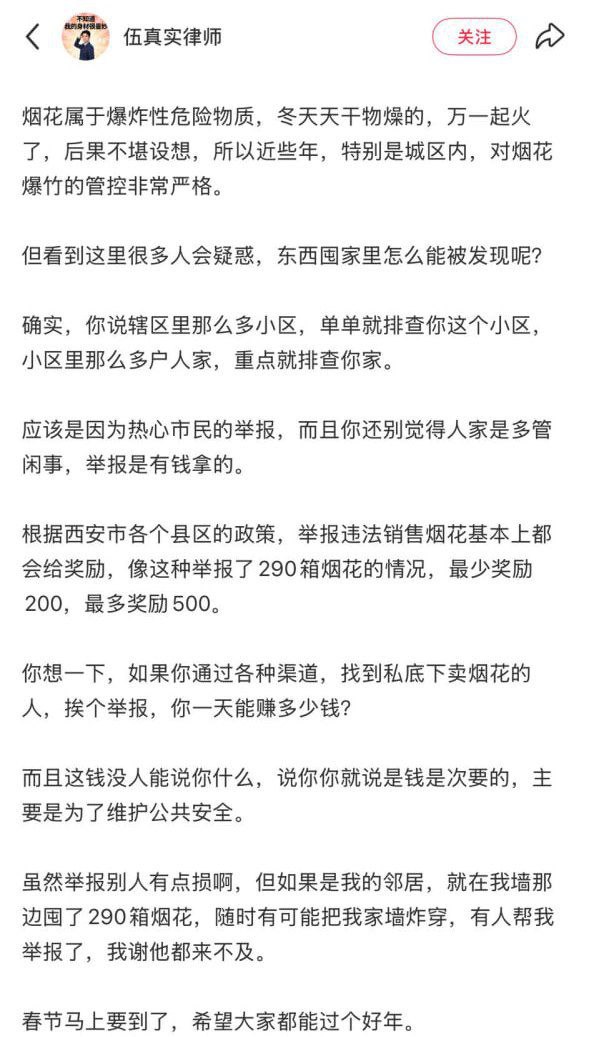 “你绝对想不到,烟花放家里,被拘15天”2月6日,一名律师发帖称,西安市高陵区一名住户,警方小区排查中被发现在家中存有290箱烟花,涉嫌违法。根据《治安管理处罚法》,可处5日至15日拘留。