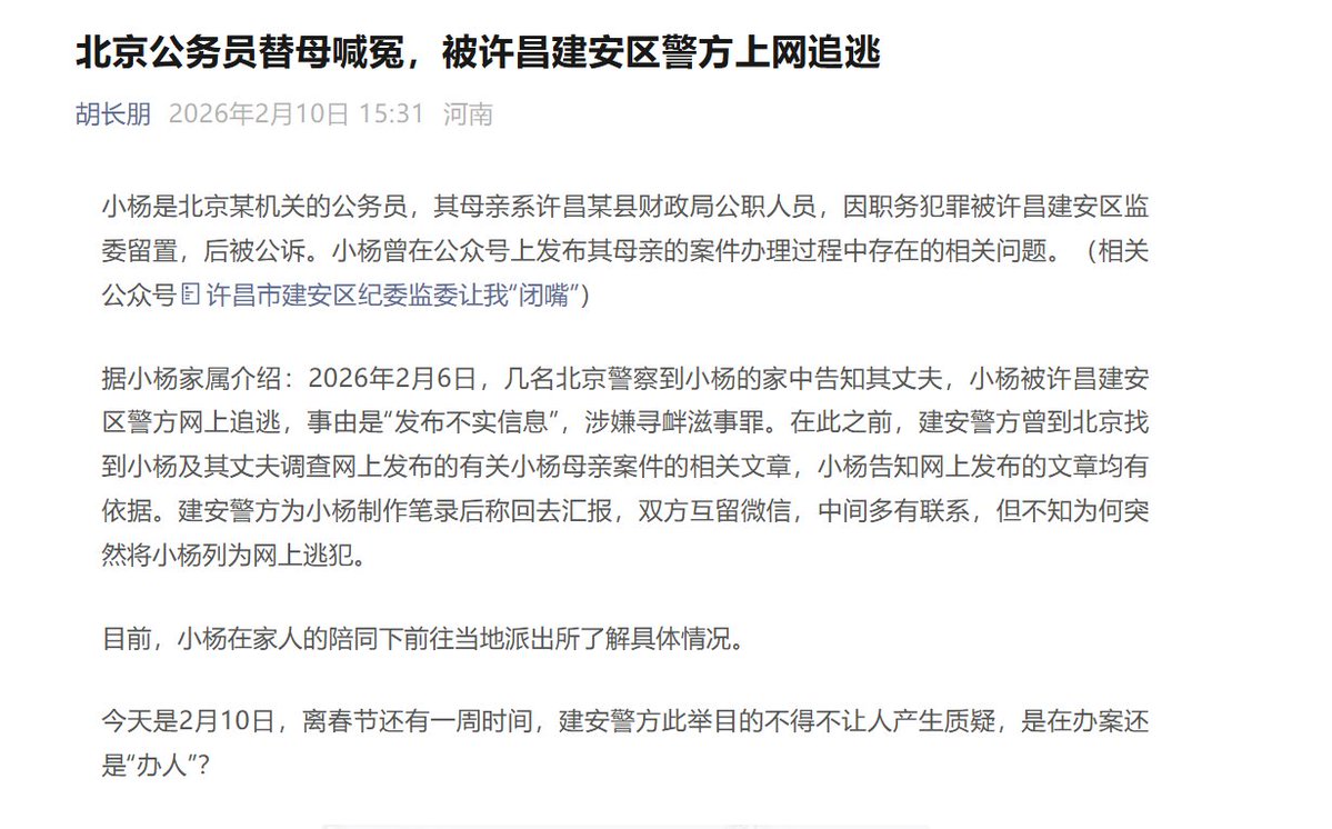 据小杨家属介绍:2026年2月6日,几名北京警察到小杨的家中告知其丈夫,小杨被许昌建安区警方网上追逃,事由是“发布不实信息”,涉嫌寻衅滋事罪。