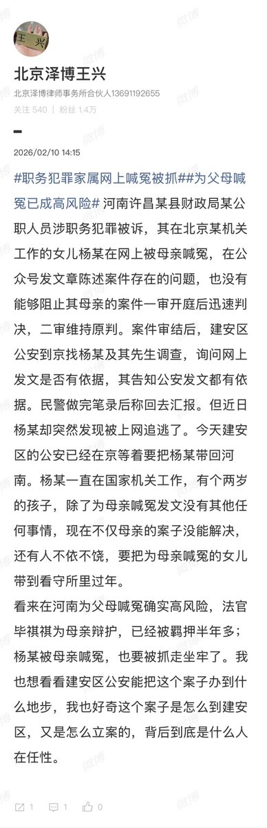 小杨曾在公众号上,发布其母亲的案件办理过程中存在的相关问题,例如:建安区纪委让母亲写笔录的时候,要求她按照纪委的要求去写,并且纪委还让母亲承认行贿10万元:“都知道是假的,你说多少钱都无所谓,只要数字对了就行,就当帮个忙”