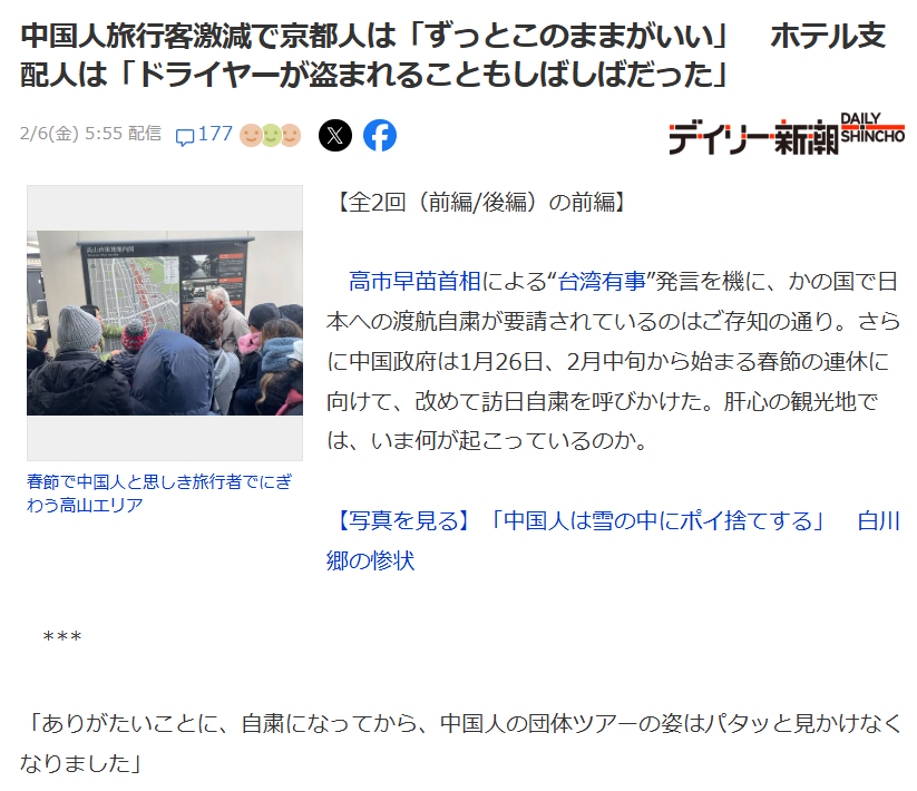 京都花街只园町南南侧地区协议会的干事太田矶一表示:中国团体游客几乎消失,路边乱丢烟头、非法白牌车、在马路中间吵闹拍照的情况明显减少,追着艺伎偷拍的行为也没了。