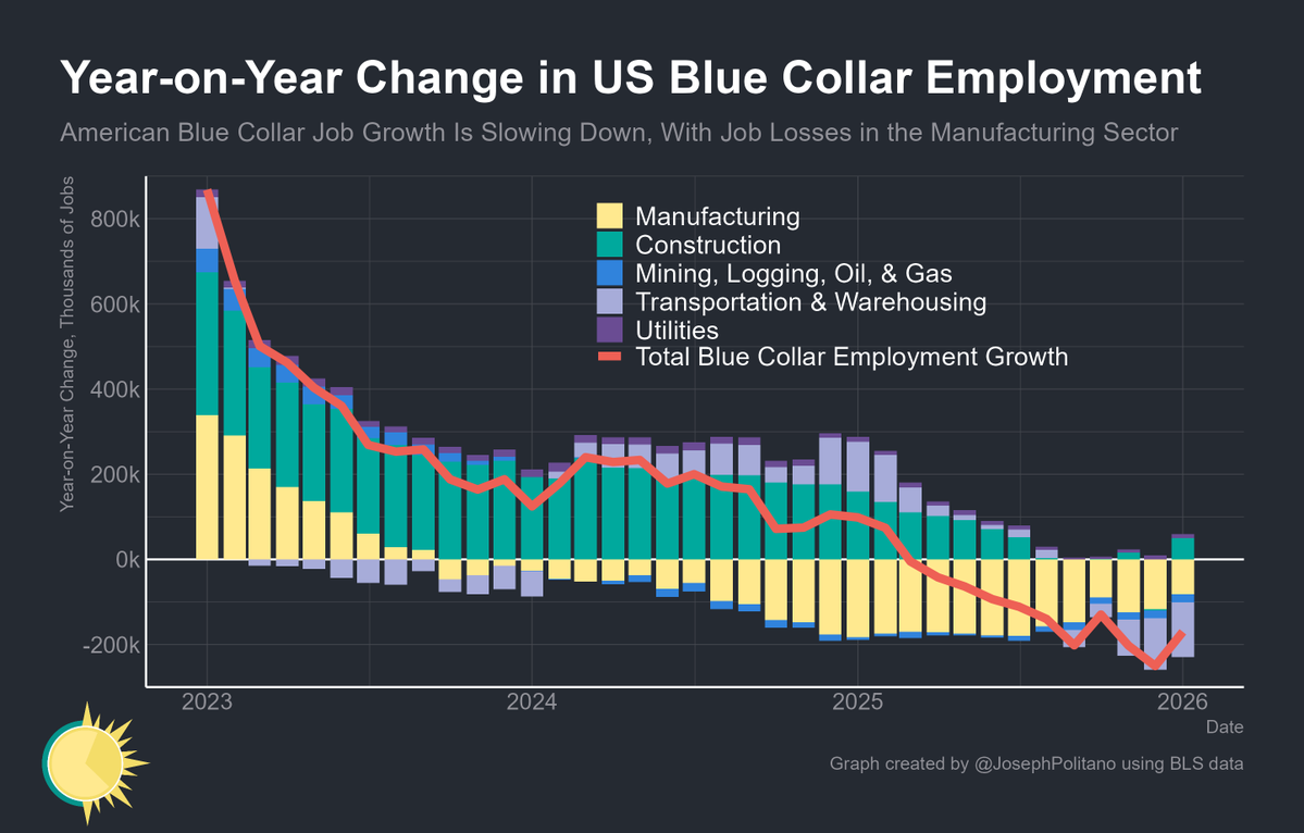 The US continues losing blue-collar jobs—year-on-year job losses have hit 170k as manufacturing, transportation, & mining industries lose jobs at a rapid pace while growth in construction remains low