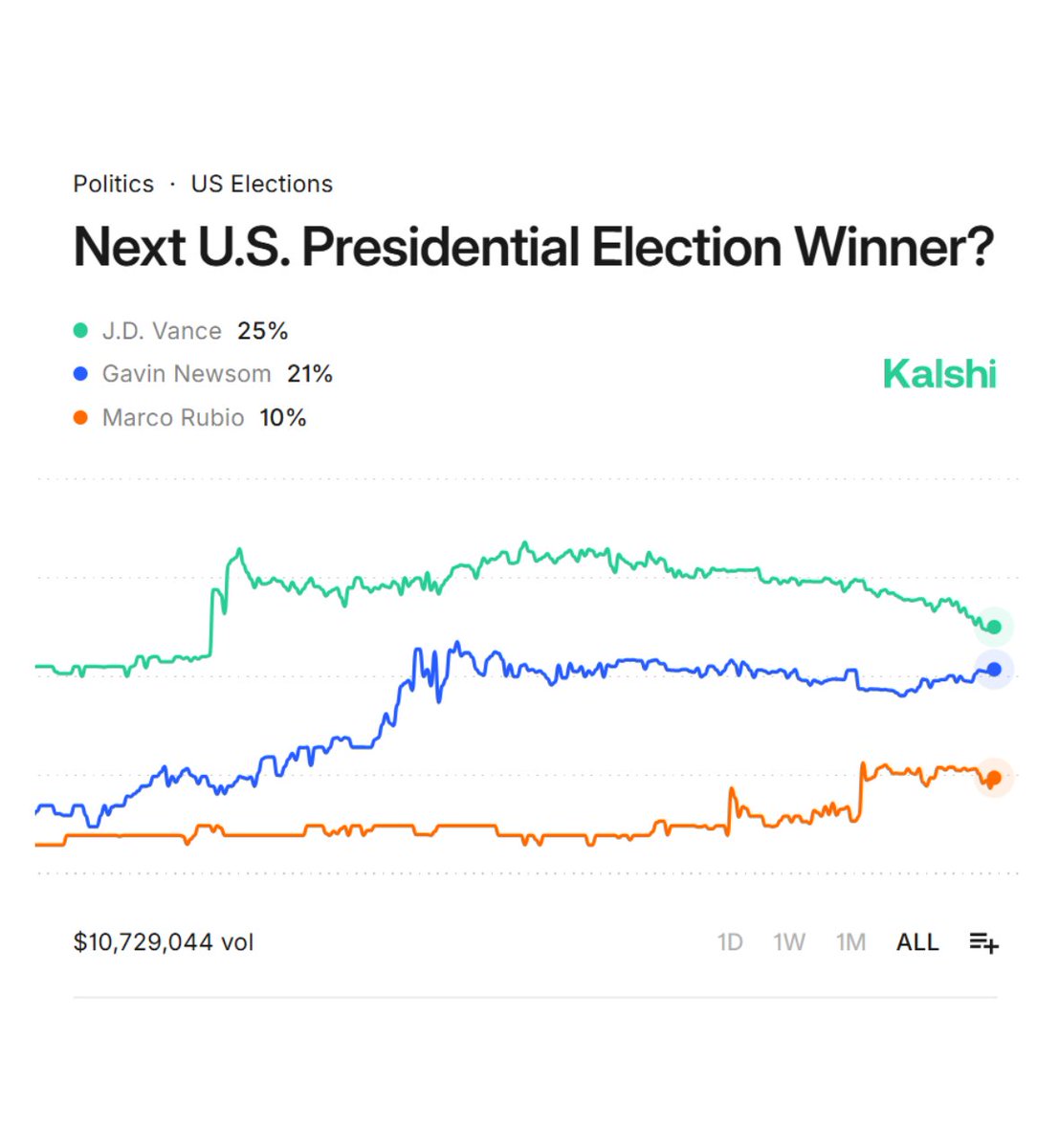 UNITED STATES: JD Vance now leads chances of winning next Presidential Election by only 4% over Gavin Newsom, the tightest margin on record, according to prediction market
