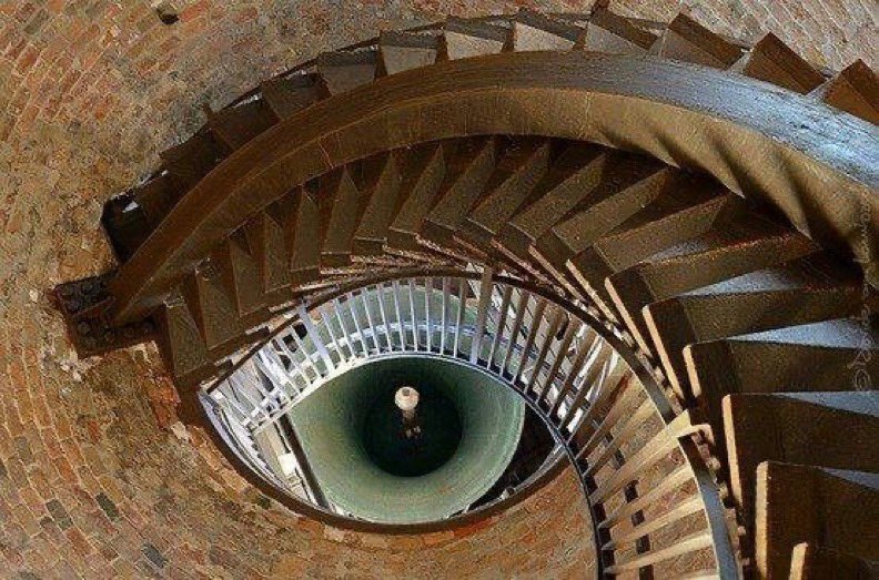 The spiral staircase of the Torre dei Lamberti in Verona, Italy, viewed from below.