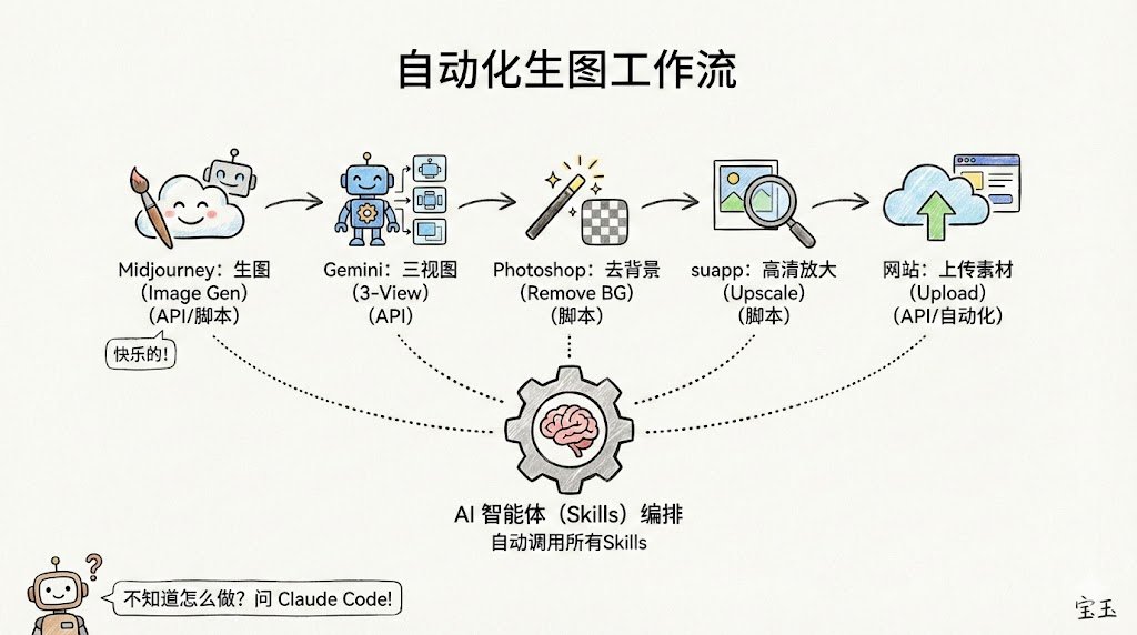 1. Midjourney生成图片如果用 API的话,可以用脚本,如果没API,可以用浏览器自动化操作(参考 baoyu-post-to-wechat Skill),做成一个skill