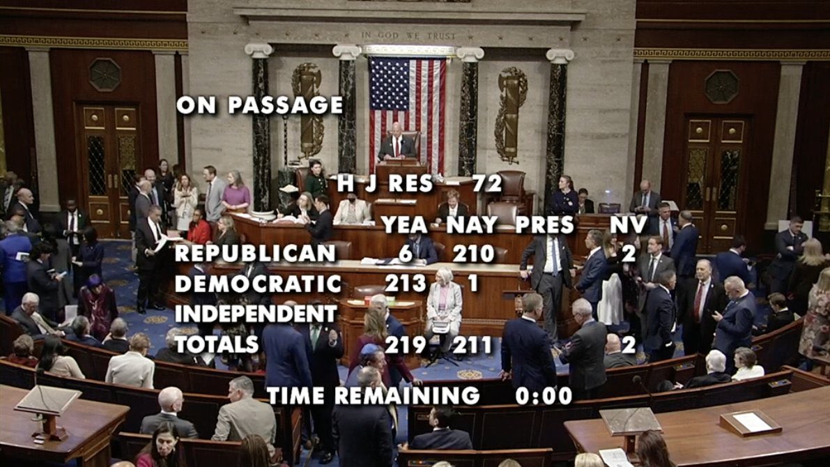 ‼️刚刚众议院投票,六名共和党议员不顾特朗普的威胁,加入民主党投票撤销对加拿大的关税!