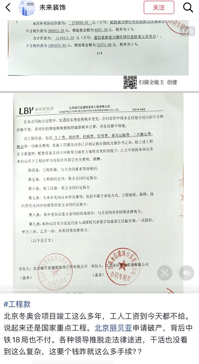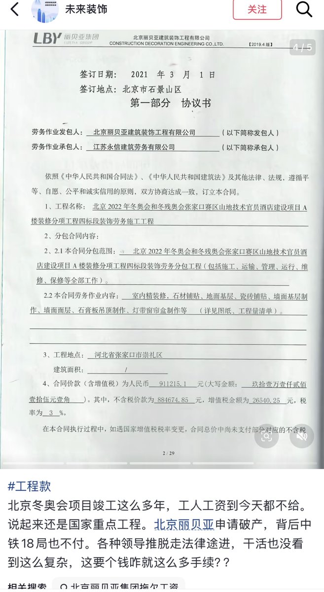 北京冬奥会项目竣工四年,至今工人们仍未拿到工资。