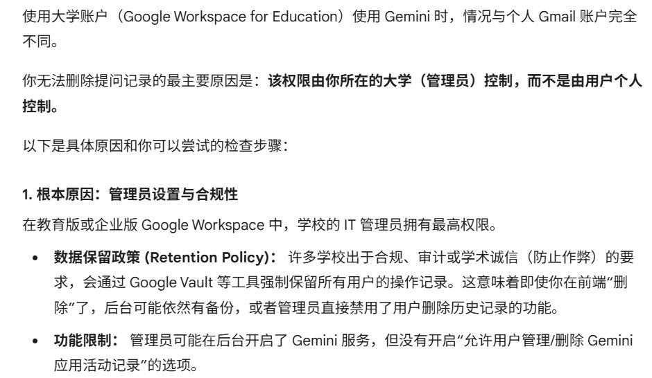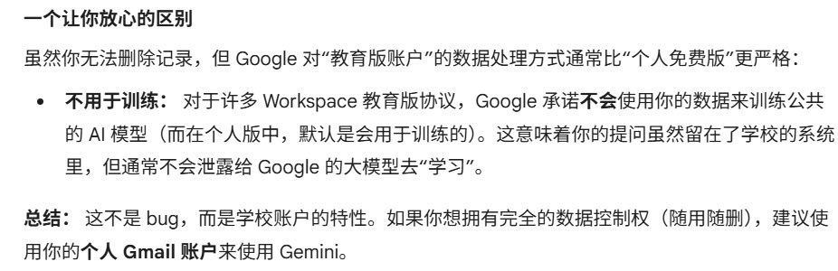 本来想着蹭学生账户免费用Gemini,结果发现不但所有记录可以被学校看到,而且自己无法删除……..