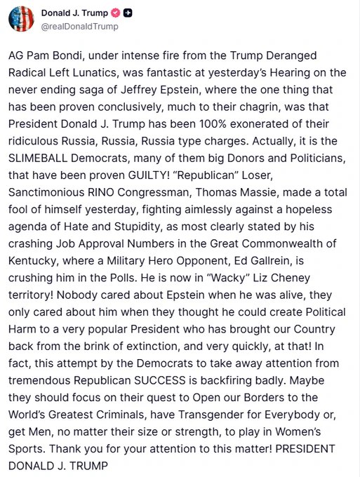 川普称,司法部长帕姆·邦迪在昨日关于杰弗里·爱泼斯坦事件的听证会上表现出色,并称听证会“证实”他已被完全洗清所谓“通俄”指控