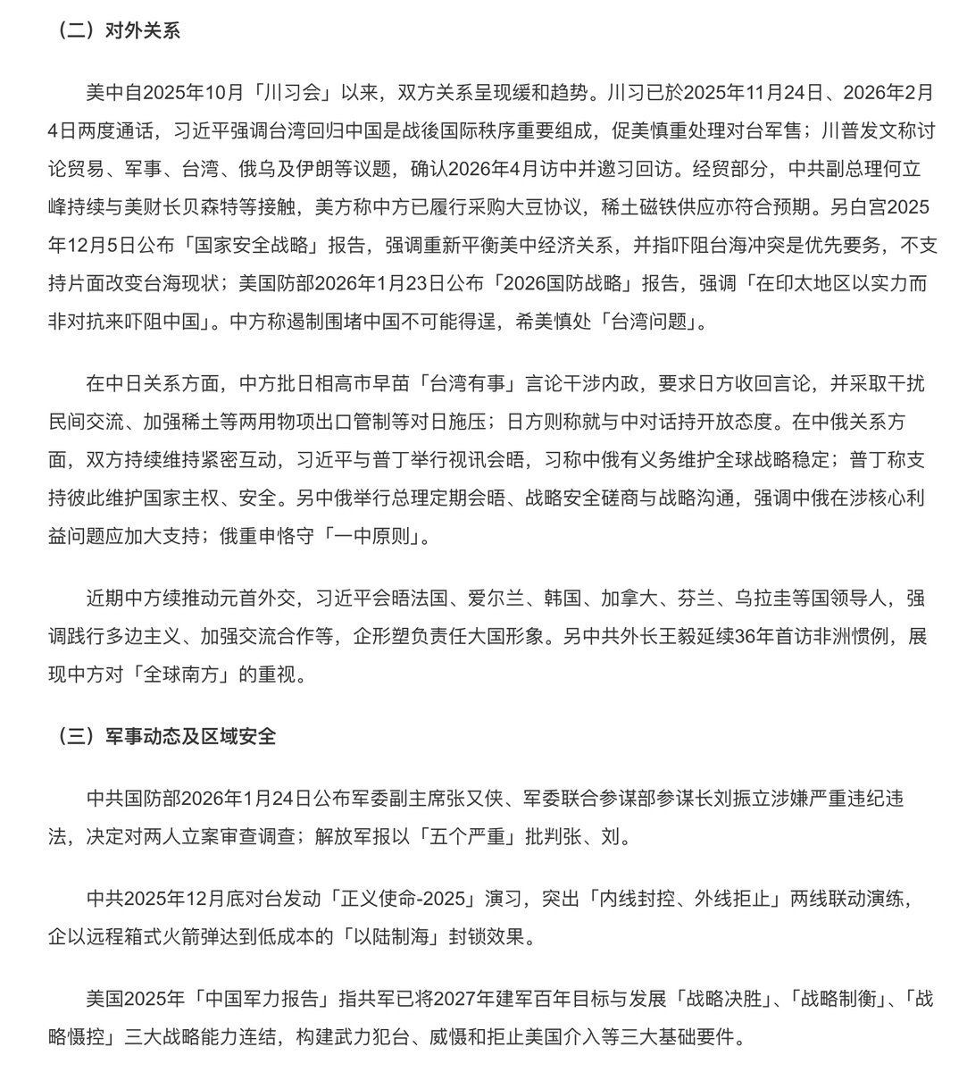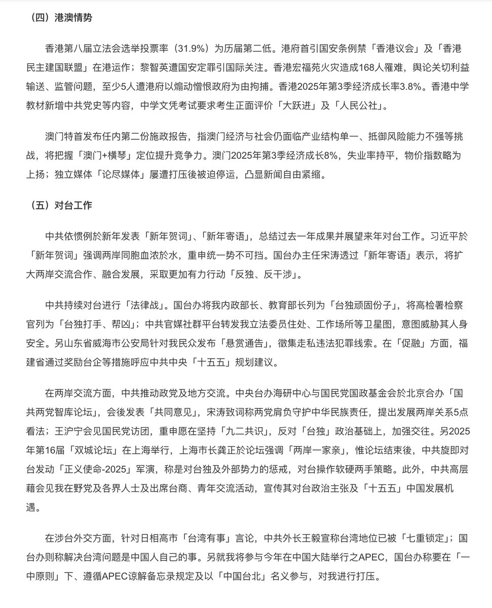 报告也说:“2025年下半年度中国大陆社会抗争大量增加,主要原因来自于经济成长趋缓、青年失业日趋严重,加以地方政府财政困难致维稳经费不足,另大量失业农民工返乡、滞乡可能威胁基层治理稳定。去年底中国大陆多个城市取消跨年活动,亦凸显中共对民众群聚行动的焦虑与维稳压力。”