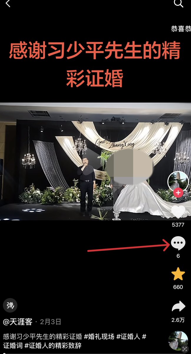 另一段婚礼视频中,因为字幕中包含“习少平”三字,随后评论被全部清空;