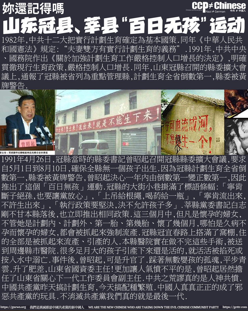 1991年,山东聊城地区的冠县县委书记曾昭起和莘县县委书记白志刚,为了降低当年人口出生率,下令自5月1日到8月10日,本地无论头胎二胎,不问合法“非法”,一个都不许生,全部强制堕胎。