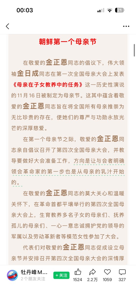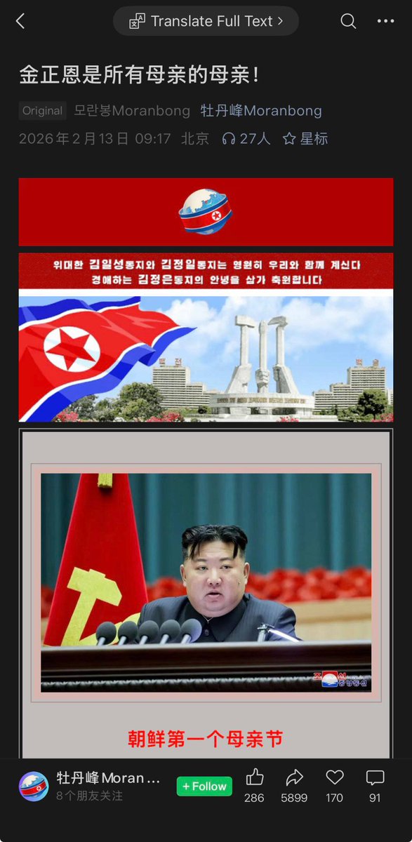 2月13日,“牡丹峰Moranbong”公众号震撼发文:《金正恩是所有母亲的母亲》 通篇 多次以加粗、放大的形式突出其“金正恩”三字,反复强调金正恩的关怀与领导,将母亲节的设立归功于其决策,并把母亲形象与国家、革命和党的事业紧密相连,构建出一种“在领袖关怀下的母爱叙事”。 文末以“所有母亲的母亲,正是我们敬爱的 金正恩”作结,整体语气高度颂扬,政治色彩鲜明。 ✋😭🤚✋😭🤚✋😭🤚✋😭🤚✋😭🤚✋😭🤚✋😭🤚✋😭🤚✋😭🤚✋😭🤚✋😭🤚✋😭🤚