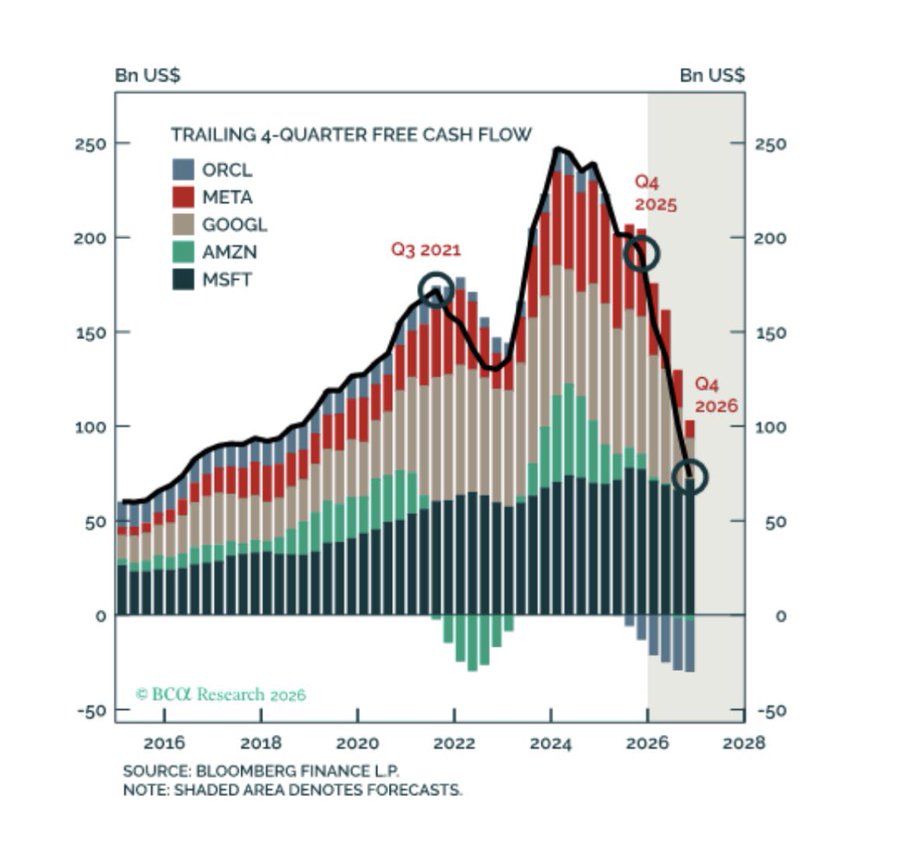 从这张表来看,MSFT的自由现金流问题不大,AMZN已经完全耗尽,ORCL最惨但已经跌完了,META开始缩水