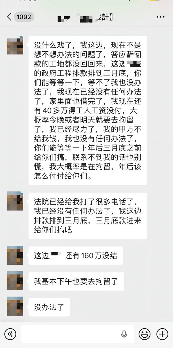 资金链断裂,因上游工程款迟迟未回款,已无力垫付工人工资,欠薪约40余万元。
